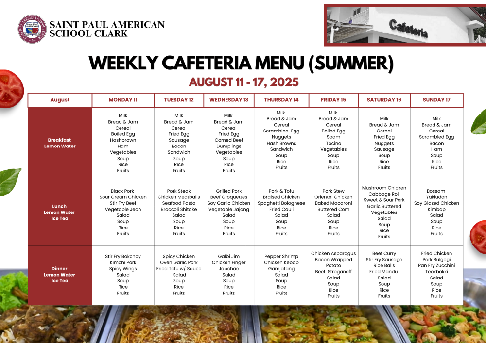 Summer Weekly Cafeteria Menu August 11 - 17, 2025
