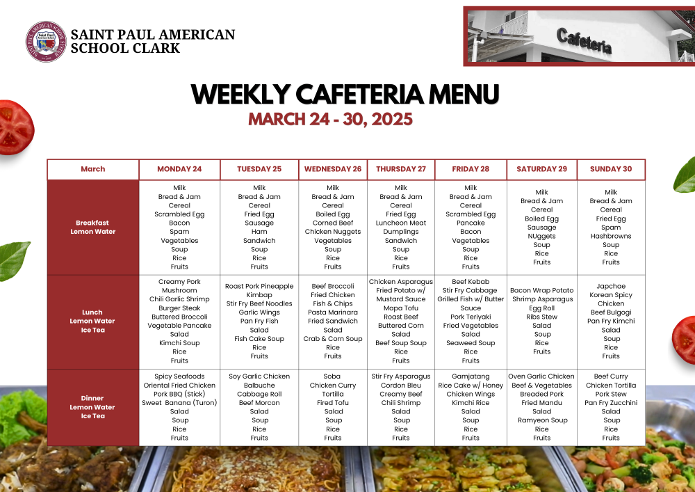 Weekly Cafeteria Menu March 24 - 30, 2025