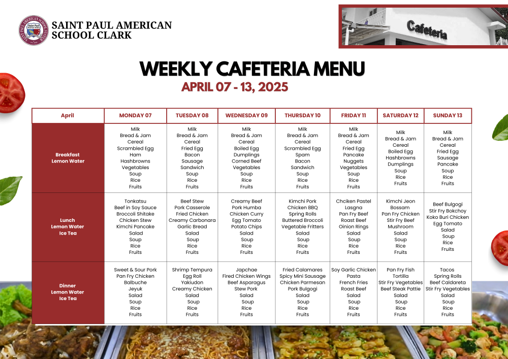 Weekly Cafeteria Menu April 7 - 13, 2025