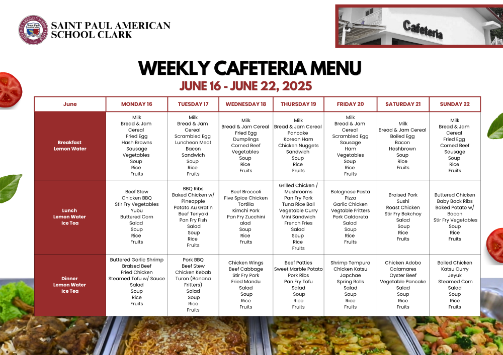 Weekly Cafeteria Menu June 16 - 22, 2025
