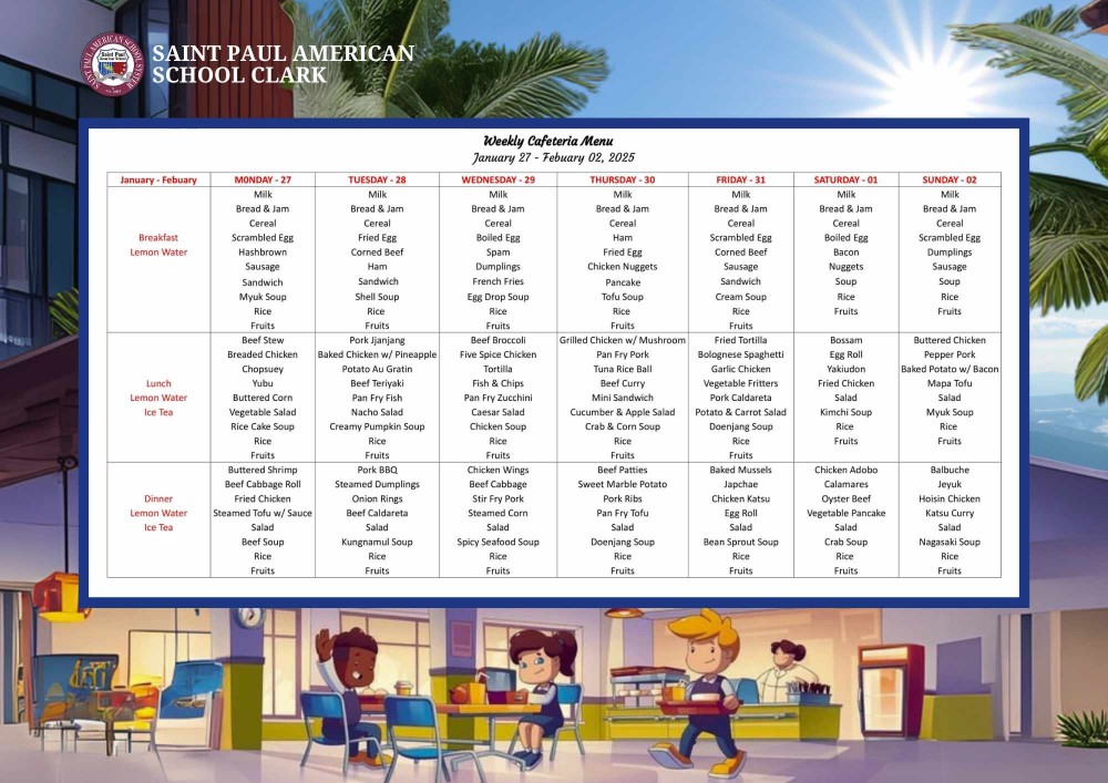 Weekly Cafeteria Menu January 27 - February 02, 2025
