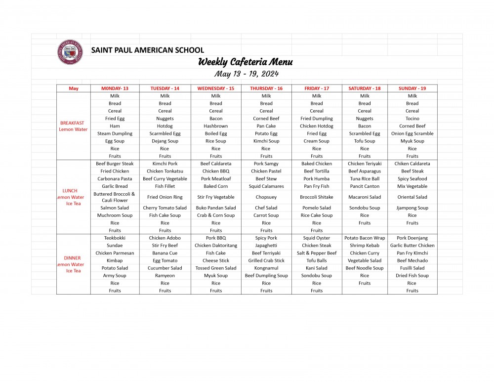 Weekly cafeteria menu may 13-19 2024