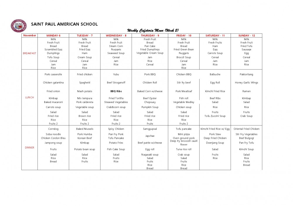 November 06 - 12 Weekly Menu 페이지 정보 By SPAS Date23-11-06 11:55 Hit24,379 Link Previous Next List 본문 Cafeteria Menu 댓글목록 등록된 댓글이 없습니다. Previous Next List