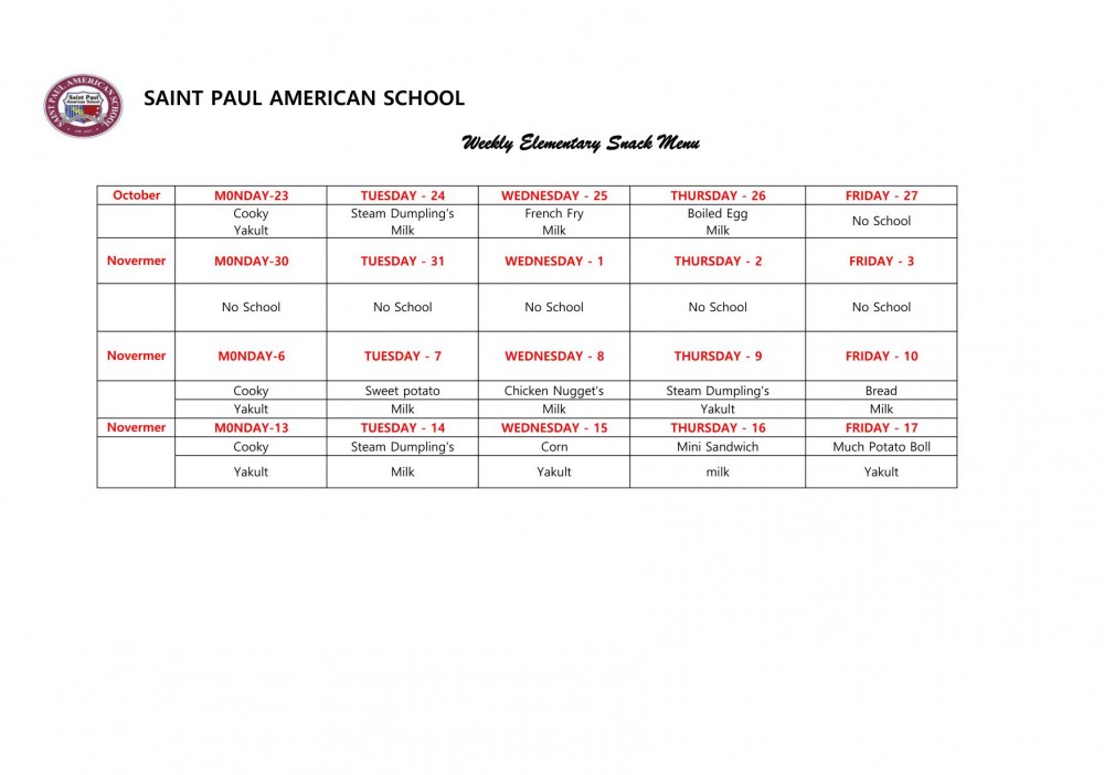 [Elementary Snack Menu] November 6 - November 17 페이지 정보 By SPAS Date23-11-06 11:58 Hit24,325 Link Previous Next List 본문 Elementary Snack Menu 댓글목록 등록된 댓글이 없습니다. Previous Next List