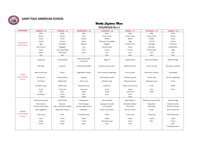 Weekly cafeteria menu Nov-week 3 페이지 정보 By SPAS Date23-11-13 16:37 Hit24,145 Link Previous Next List 본문 Weekly cafeteria menu Nov-week 3 댓글목록 등록된 댓글이 없습니다. Previous Next List