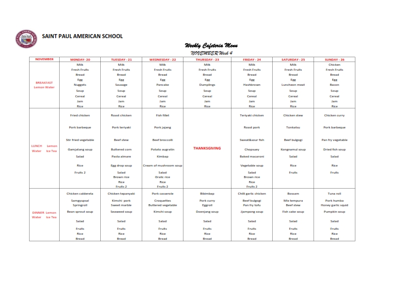 Weekly cafeteria menu Nov-week 4 페이지 정보 By SPAS Date23-11-13 16:38 Hit24,191 Link Previous Next List 본문 Weekly cafeteria menu Nov-week 4 댓글목록 등록된 댓글이 없습니다. Previous Next List